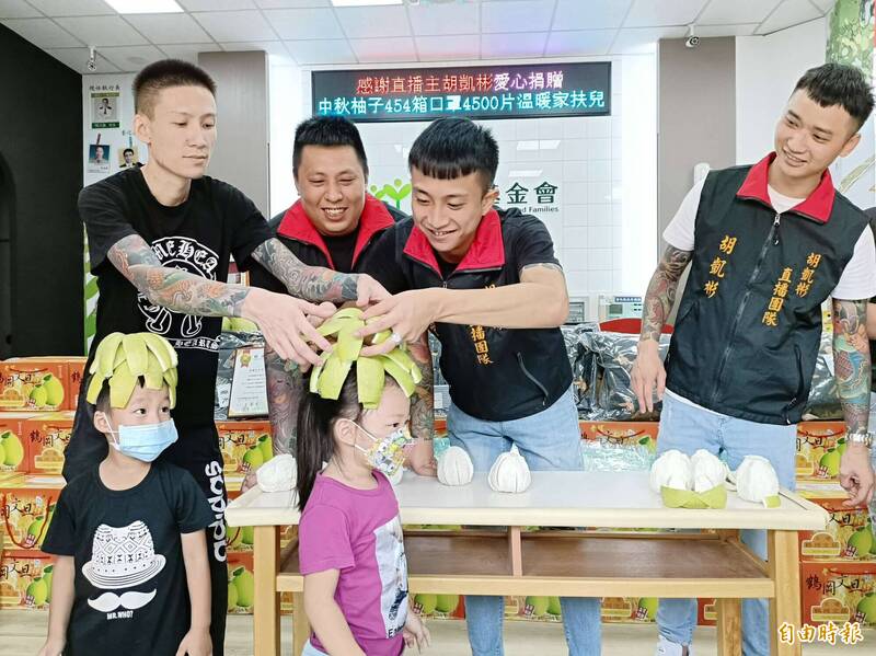 彰化家扶中心老朋友的直播主胡凱彬(右1)等人今天在中秋節前夕送來454箱柚子,還指導家扶兒玩起小時候剝柚子皮當帽子的遊戲,現場歡笑聲不斷。(記者湯世名攝)