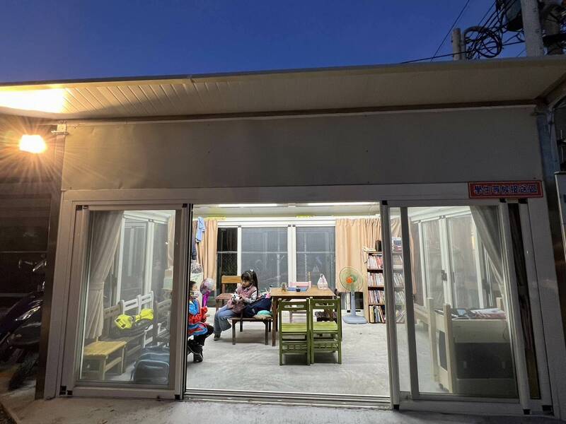 文祥國小將學校車庫改裝成玻璃小屋,室內設置桌椅、書籍,讓學生放學時待在室內,由師長與保全陪伴等候家長接送,讓家長「揪感心」。(文祥國小提供)