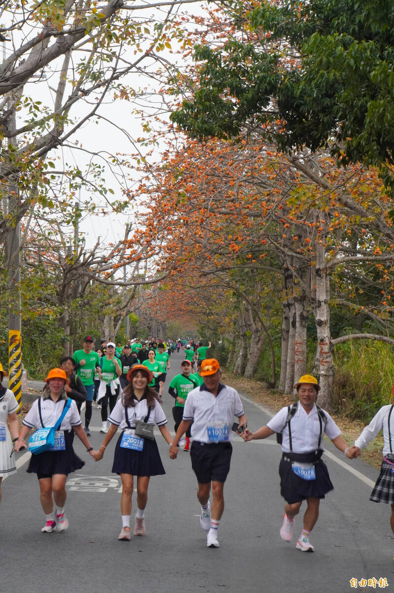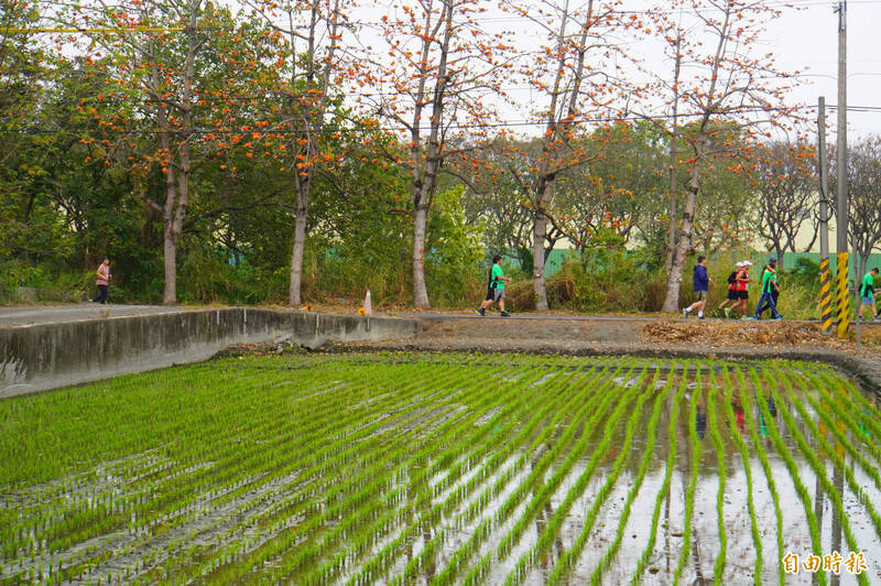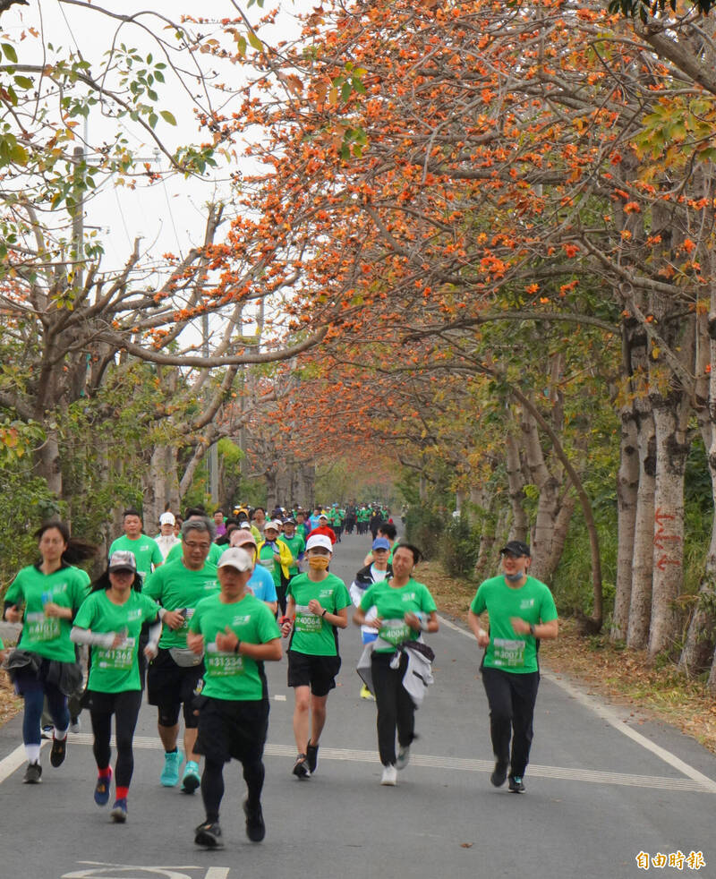 矽品馬拉松登場,選手跑過紅色的木棉花道,穿過綠色的稻田。(記者顏宏駿攝)