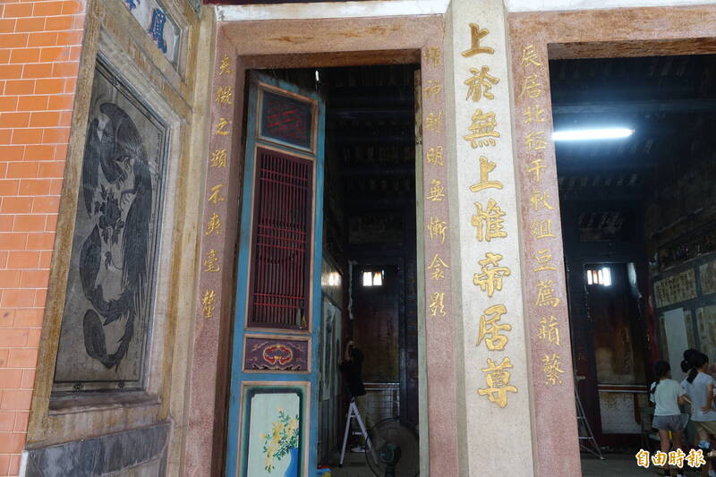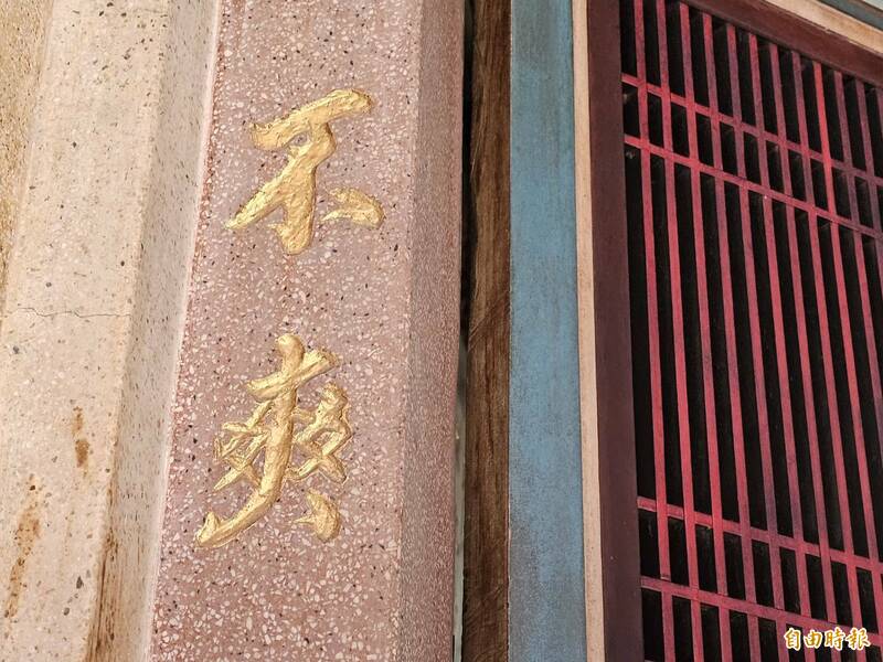 鹿港福興許厝埔拱辰宮即將拆除重建,虎邊門聯下聯赫見「不爽」兩字。(記者劉曉欣攝)