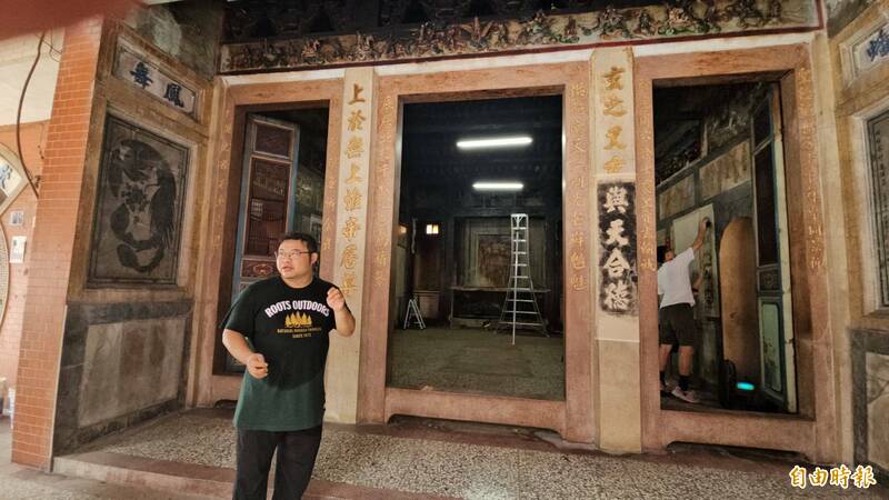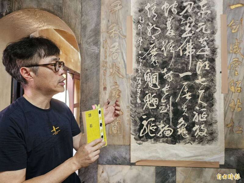 台南大學國文系副教授林俊臣說,拱辰宮的書法碑文,全是半世紀前鹿港最頂尖的書法前輩作品。(記者劉曉欣攝)