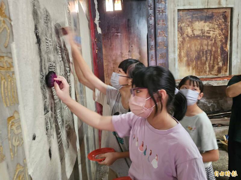 小朋友在鹿港福興拱辰宮初體驗拓碑,拓碑將宮廟的詩詞書畫作品保存下來。(記者劉曉欣攝)