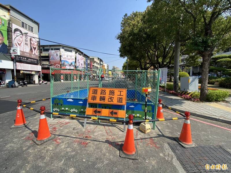 施工單位在施工路口前架設車輛改道行駛的告示牌。(記者張聰秋攝)