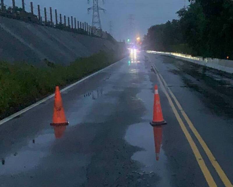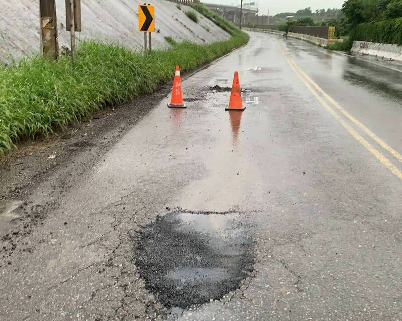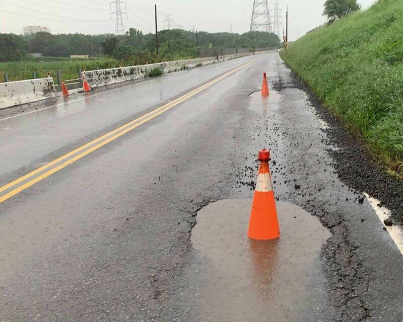 伸港鄉濱海防汛道路被大雨炸出坑洞,縣府緊急放三角錐示警。(縣府提供)