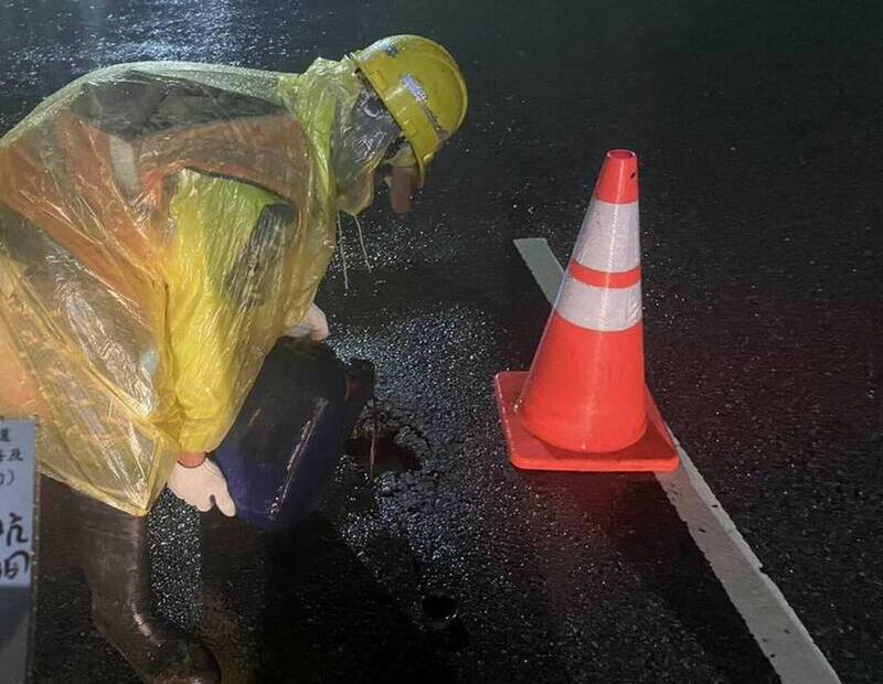 公路局彰化工務段派員在黑夜中冒雨修補省道坑洞。(彰化工務段提供)