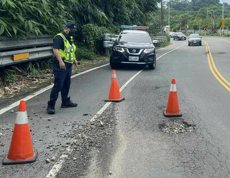 日前花壇鄉環山路出現坑洞,1名機車騎士輾過摔傷。(警方提供)