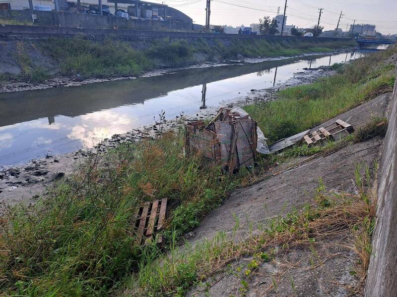 彰化縣伸港鄉田尾排水蚵寮段遭丟大量棧板,禍首被警方查獲。(議員賴清美提供)