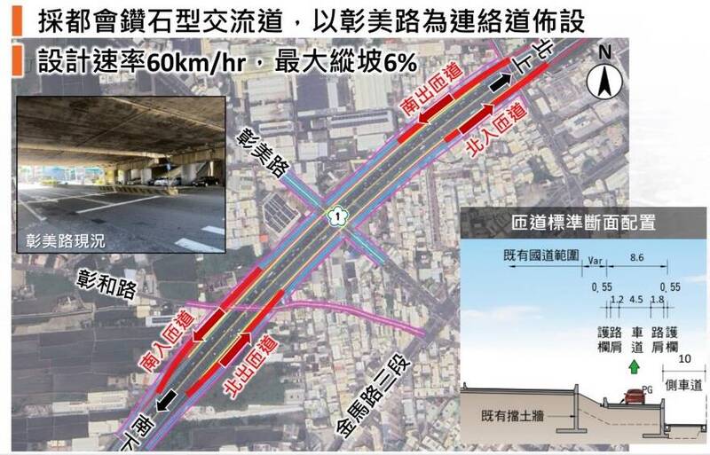 和美鎮長林庚壬表示,計畫新增的「彰美交流道」,將比照台76線的林厝交流道,也就是上下匝道的「都會鑽石型交流道」來設計,以彰美路為聯絡道,新增交流道不只預留第5車道空間,再打造上下匝道,所需用地面積約為14.7公頃,其中公有地有12.6公頃,私有地有2.1公頃,目前現有建物有115戶,其中59戶是鋼筋水泥建物,其餘均為鐵皮屋、磚造屋或是鋼棚。