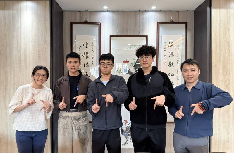 彰中科學班今年學測亮麗,班導師張佑慈(由左而右)、學生張家滏、陳俊宇、林汯樹,還有教務主任吳國禎,師生共享榮耀。(彰中提供)