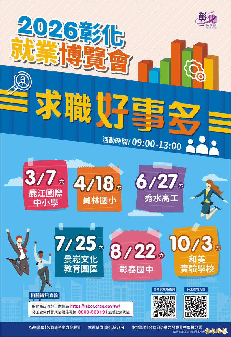 縣府表示,今年以「求職好事多、就業選擇多」為主軸,在6個生活圈舉辦大型就博會,時間地點分別為3月7日鹿江國際中小學、4月18日員林國小、6月27日秀水高工、7月25日田中景崧文化教育園區、8月22日彰泰國中及10月3日和美實驗學校,每場預計提供1000個以上職缺,讓民眾就近求職。