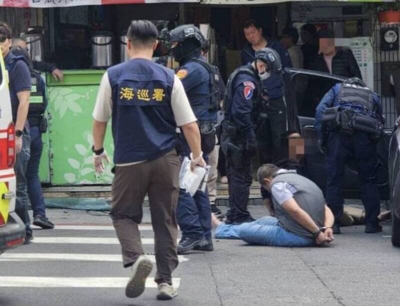 這起圍捕行動發生在員水路,現場店家聽「碰」一聲巨響,只見數部偵防車前後包抄一輛轎車,轎車被撞到嚴重凹陷變形,海巡署人員與頭戴防彈盔的霹靂小組特警迅速下車,衝上前將車內兩名男子拖出車外,壓制在地。