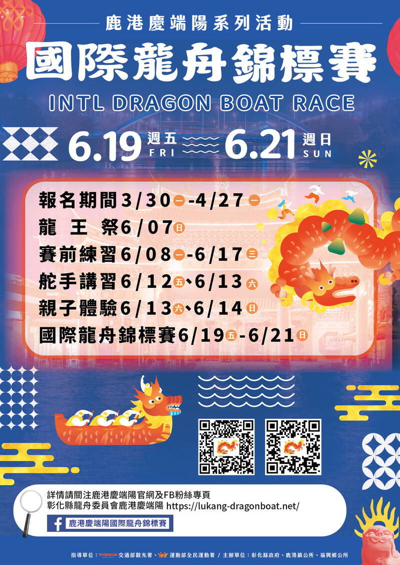今年鹿港慶端陽系列活動的國際龍舟錦標賽,將於6月19日至21日在彰化福鹿溪登場,即日起開放報名至4月27日截止,最高獎金30萬元。(圖由縣府提供)