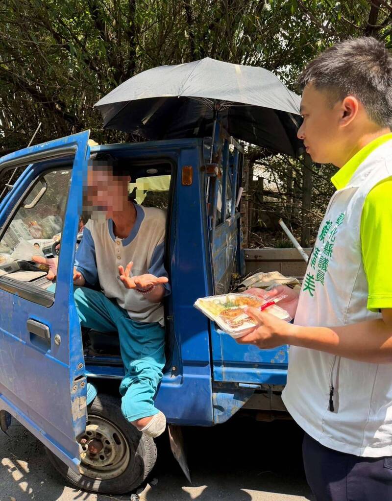 賴清美與兒子曾煥燁今天中午帶著便當前往探視黃姓男子,巧遇鄰居也買東西給他食用,一會兒新港村長蔡復成也來到現場,村長表示將協助黃男明天就醫,讓醫生評估他目前狀況;其吃睡的小貨車頂則插著一把善心民眾提供的傘遮陽。