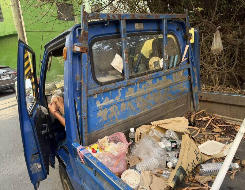 黃男蝸居小貨車,吃睡都在車上。(圖由賴清美提供)