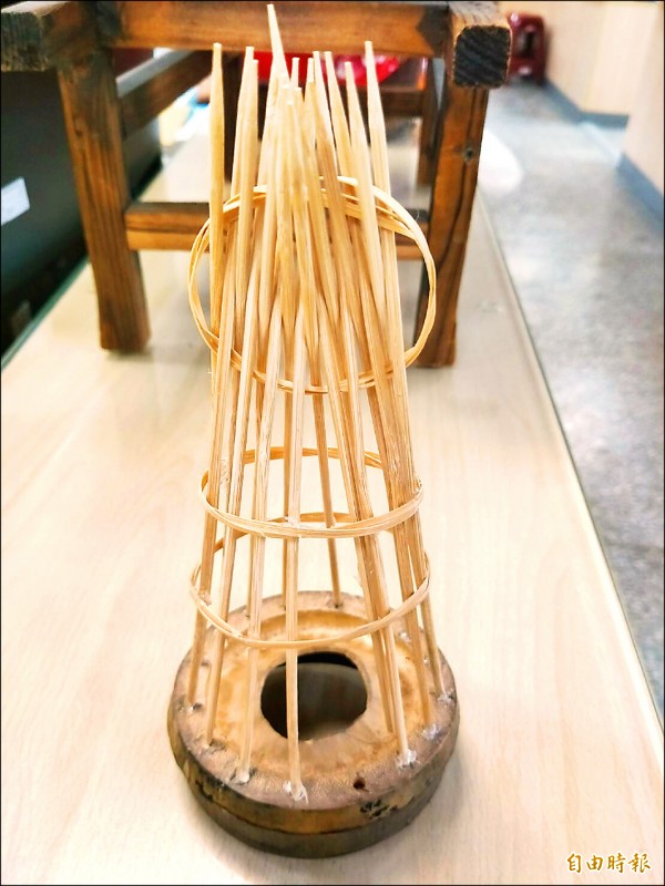 石笱(即是籠仔篙)製作專家謝己清,以古法示範製作籠仔篙。(記者陳冠備攝)