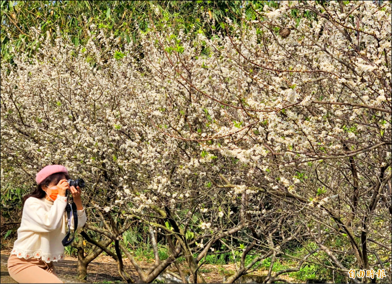 李成濟表示,李花花期到二月底,成串白色花朵堆滿枝頭,且呈現濃烈的白,遠望好像樹枝披了一層白雪,遊客漫步園區,有如欣賞雪景,每年都吸引爆滿人潮來賞花,民眾也可利用平日人潮較少時段賞花,別有一番風情。