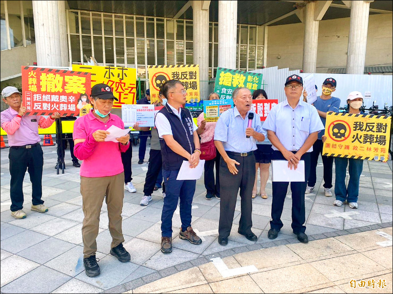 西勢里長蔡福助(左二)及芳苑反火葬場自救會成員在內近20人前往縣府廣場抗議,高喊「撤案」口號,並表達反對該案與芳苑火葬場。(記者張聰秋攝)