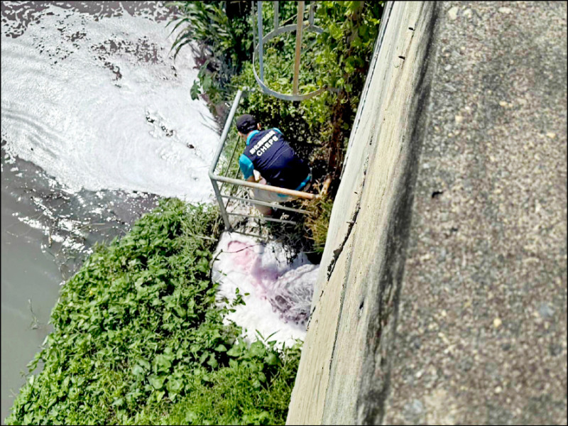 秀水石笱排水連續兩天傳出偷排事件,環保局人員前往採樣。(彰縣環保局提供)