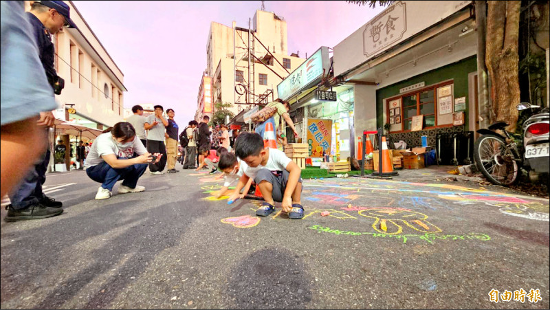 彰化市陳稜路在雙十連假進行「行人優先」示範區,小朋友進行街道畫畫實驗行動。(記者劉曉欣攝)