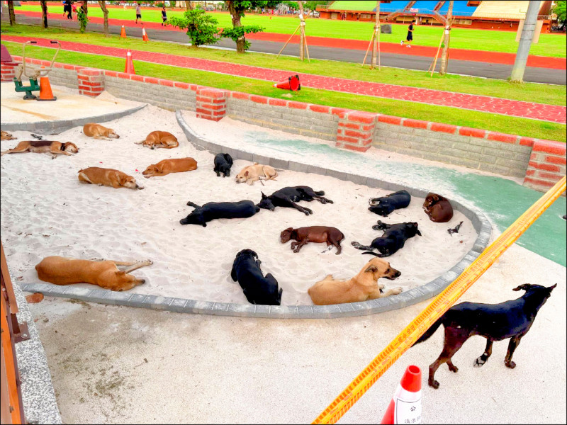 鹿港體育場兒童遊戲沙坑出現浪浪團,民眾直擊有廿二隻。(取自網路)
