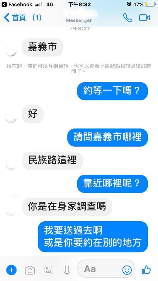 賣家把臉書Messenger對話擷圖貼上臉書社團「爆怨公社」,他表示,20日當天下午自己被他下單後,在4點立刻回覆對方,不料買家在晚間8點才回覆訊息,指定要在嘉義市民族路面交,自己只是詢問他面交的大概地點,就被反嗆「你是在身家調查嗎」,讓他感到相當無奈。