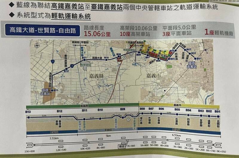 市府去年6月完成輕軌藍線可行性研究報告書,提報交通部審議,今年元月交通部回文,由嘉義縣、市各負擔180億元、68億元開發。