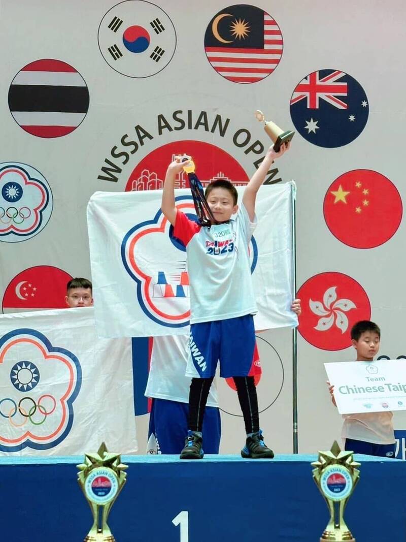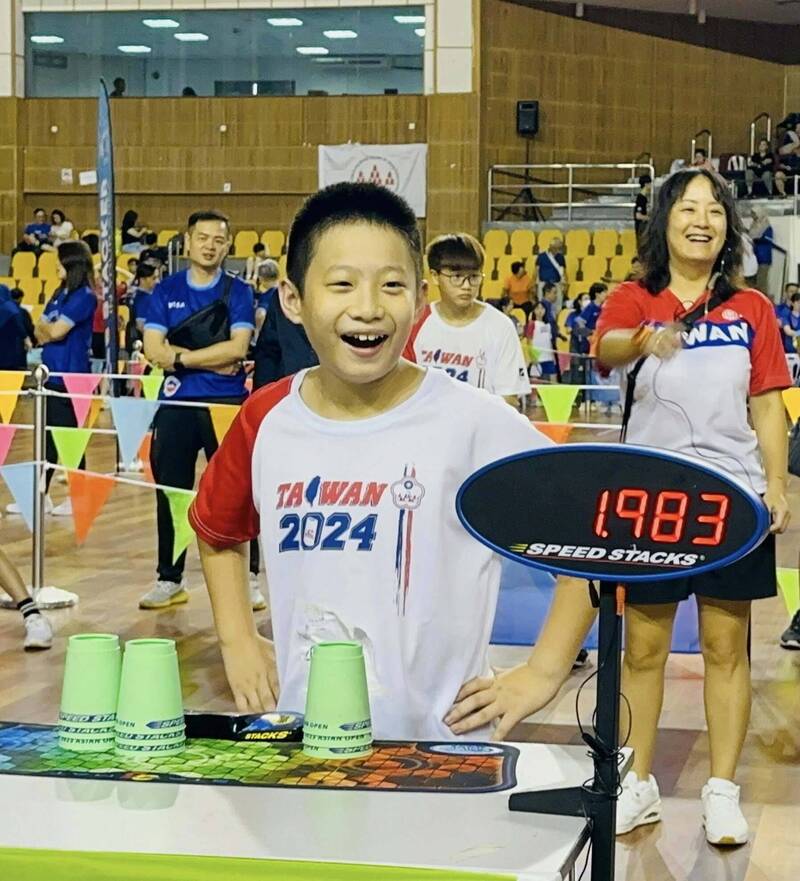 育人國小六年級學生汪佑叡在競技疊杯國際賽事獲得好成績。(育人國小提供)