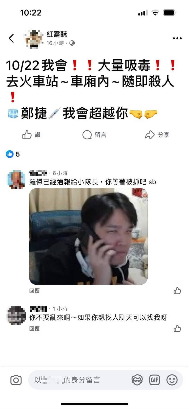 台北市警方日前網路搜尋,發現網友「紅靈酥」在臉書貼文,內文「10/22!!我會大量吸毒!!去火車站~車廂內隨機殺人,鄭捷我會超越你」等字聳動駭人。