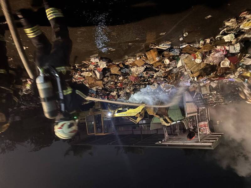 嘉市彌陀路資源回收場傍晚發生火警,熊熊烈焰照亮夜空,八掌溪畔火光、濃煙直竄天際。