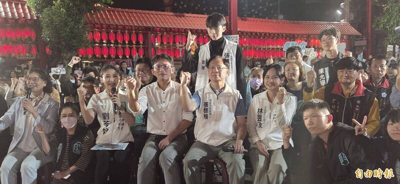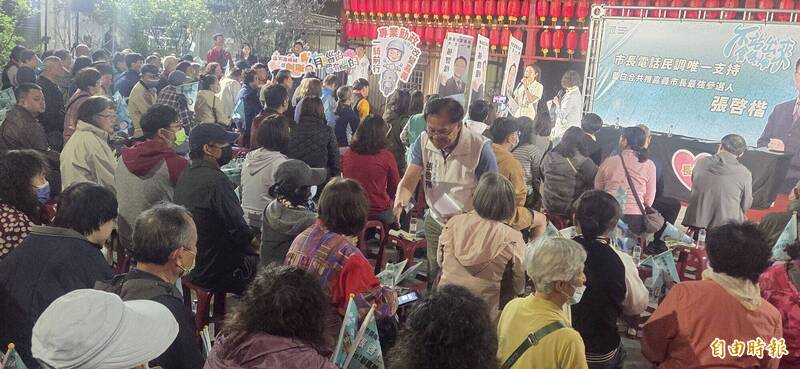 民眾黨嘉義市長參選人張啓楷(中)今晚在文財殿舉行首場廟口開講。(記者丁偉杰攝)