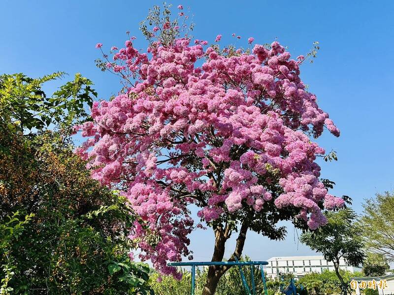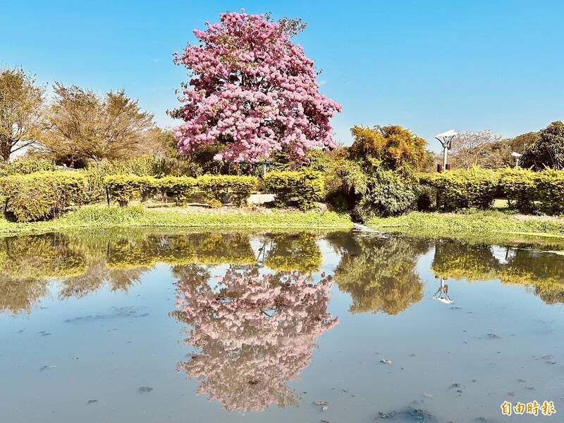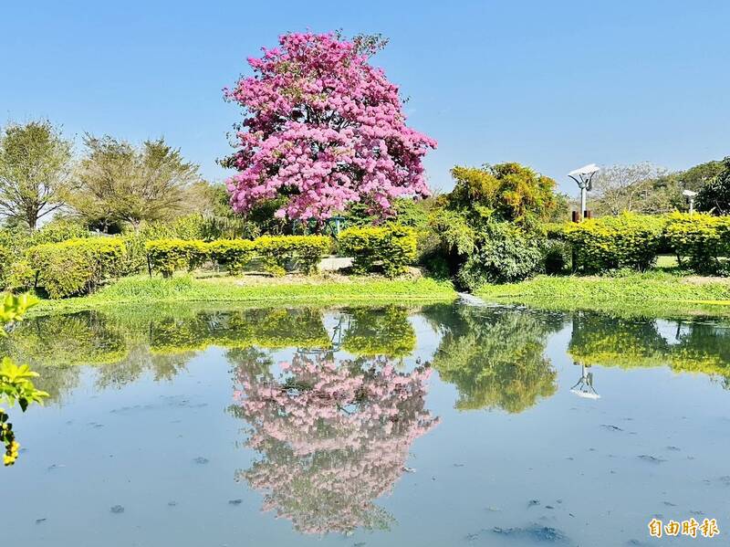 嘉義大林明華濕地風鈴木盛開、花團錦簇。(記者蔡宗勳攝)