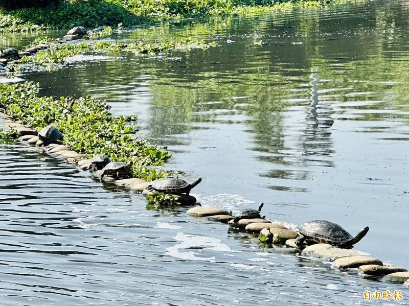 嘉義大林明華濕地烏龜日光浴有趣畫面。(記者蔡宗勳攝)