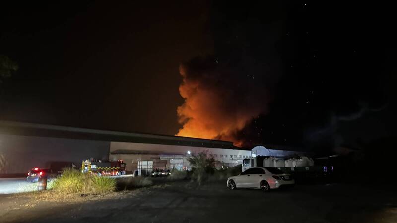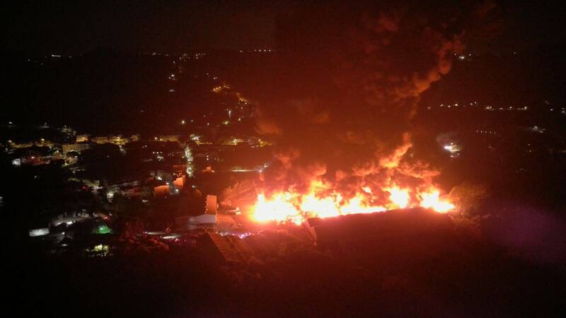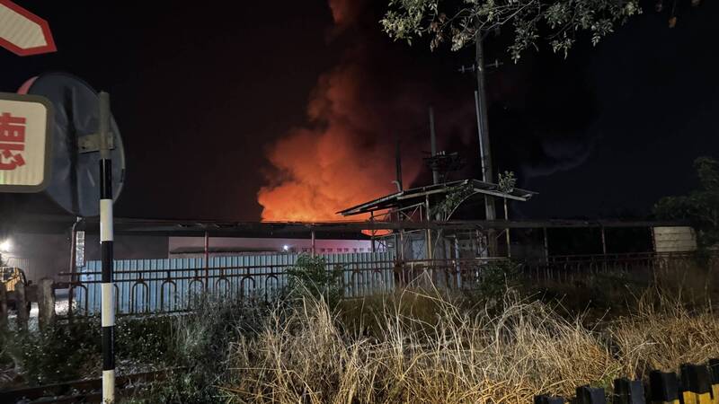 「台灣涼椅」公司閒置廠房昨晚祝融,廠房全面燃燒畫面曝光。(嘉義縣消防局提供)