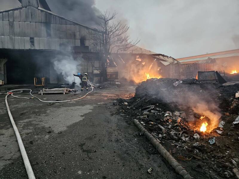 嘉義縣竹崎灣橋台灣涼椅公司閒置廠房火警,廠方被猛烈火勢燒得焦黑。(嘉義縣消防局提供)