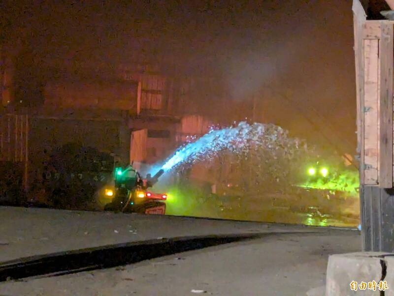 嘉義縣消防局出動消防機器人做周界防護,避免火勢延燒。(記者王善嬿攝)