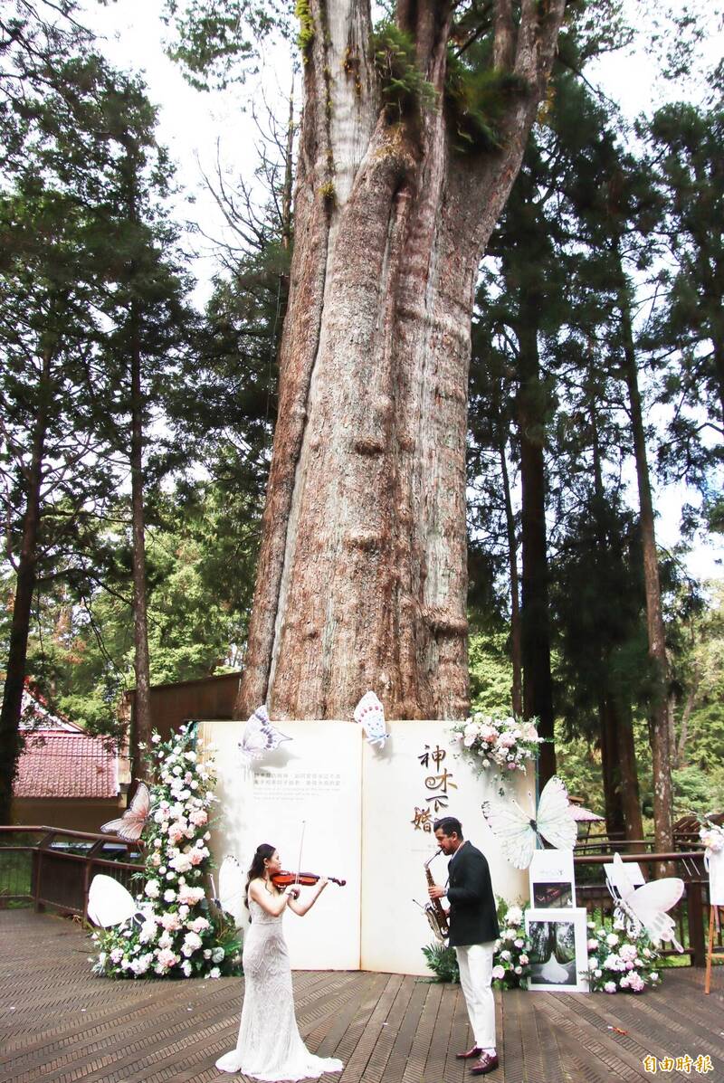 交通部觀光署阿里山國家風景區管理處辦理阿里山神木下婚禮,邁入第19年,獲選為台灣觀光雙年曆國際級活動,吸引來自巴西、德國、澳洲、英國、日本及台灣共15對新人參與,巴西新郎Diogo Pinheiro與台灣新娘曾妃攸今天更在神木下以小提琴與薩克斯風演奏樂曲,氣氛浪漫,來自各國的新人家屬一同見證新人們永恆的誓言,非常感動。