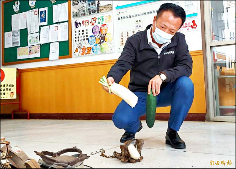 嘉義縣長翁章梁用蘿蔔觸發捕獸鋏,瞬間被切斷。(記者林宜樟攝)