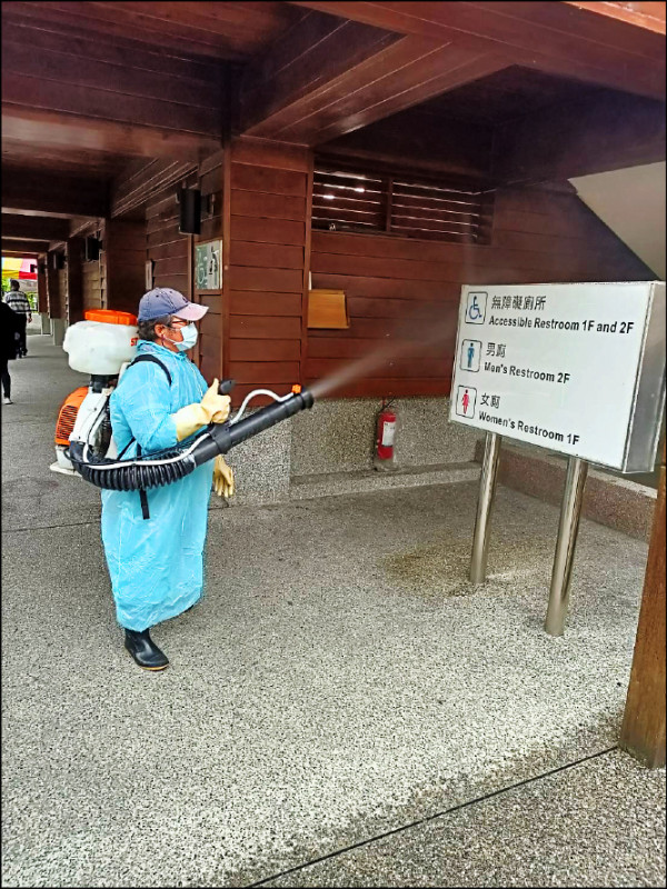 阿里山國家森林遊樂區接獲通報後,已展開室內外加強消毒作業。(嘉義林管處提供)