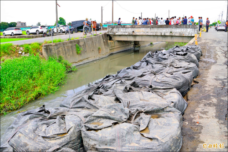 雲林二崙新庄子大排護岸在風災及連續豪雨崩塌,以太空包及混凝土加固。(記者黃淑莉攝)