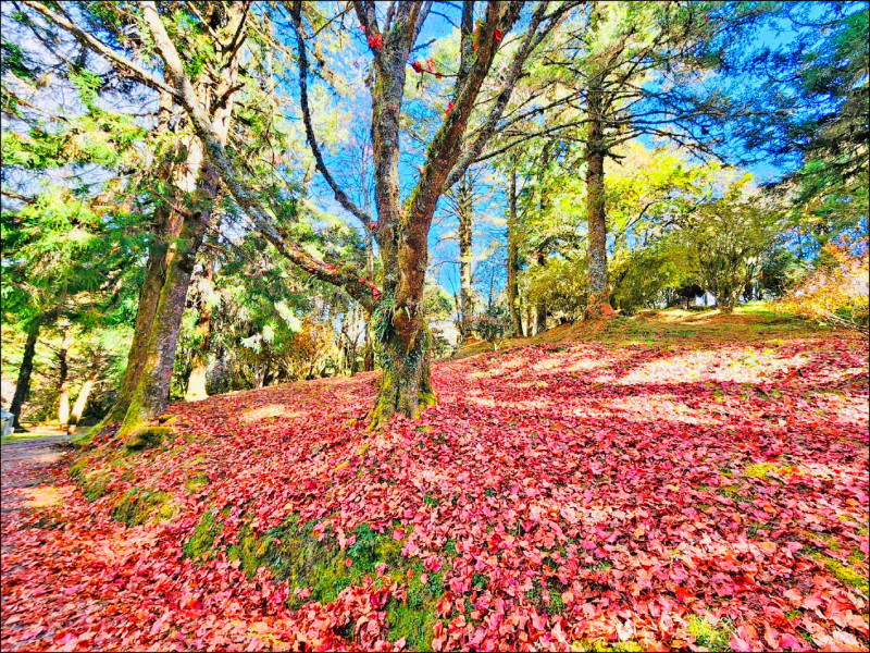 阿里山國家森林遊樂區詩情畫意的楓紅地毯。(嘉義林業分署提供)