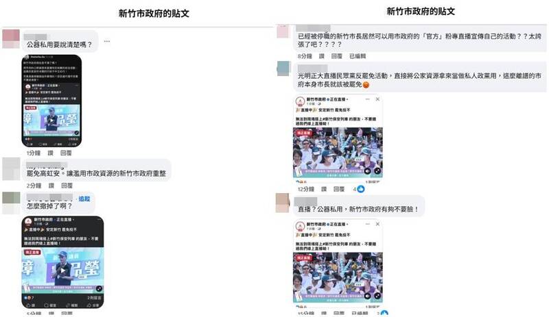 竹市政府被抓包後馬上下架直播,但仍遭網友們灌爆,「怎麼撤掉直播了?你們還會心虛喔?」、「已經被停職的新竹市長居然可以用市政府的『官方』粉專直播宣傳自己的活動?太誇張了吧」、「直播?公器私用,新竹市政府有夠不要臉!」、「繼續直播啊,幹嘛又關直播?會怕喔」、「罷免高虹安。讓濫用市政資源的新竹市政府重整」、「公器私用要不要出來說清楚?」、「光明正大直播民眾黨反罷免活動,直接將公家資源拿來當做私人政黨用,這麼離譜的市府,本身市長就該被罷免」