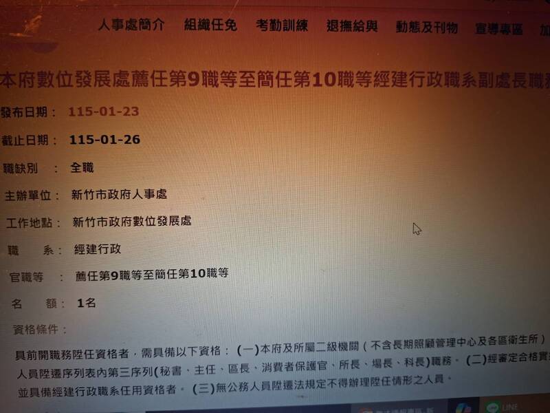 新竹市數發處及養工處未成立,市府人事處就開副處長缺內陞甄審公告,且僅2天作業日,遭疑已內定人選。(記者洪美秀翻攝)