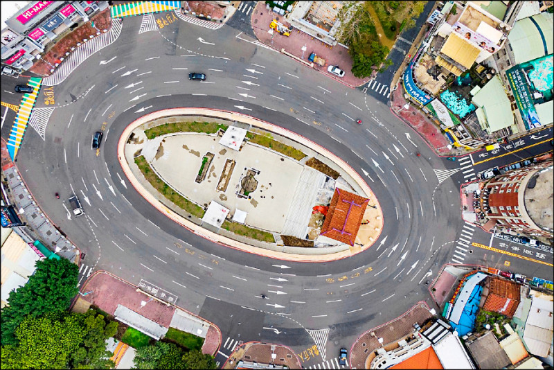 新竹市府推動步行城市再升級!東門城圓環四周的人行道今天起進行拓寬工程,除圓環人行道由五米拓寬到九米,也會縮減圓環的車道,預計十月底完成。 (市府提供)