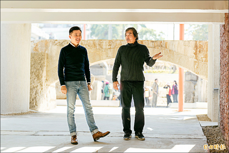 新竹市長林智堅(左)與建築師邱文傑視察東門城情形。(記者洪美秀攝)