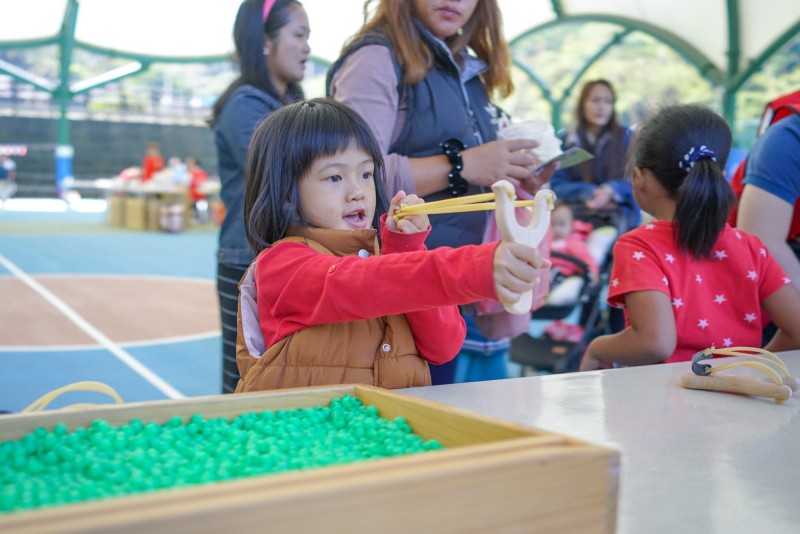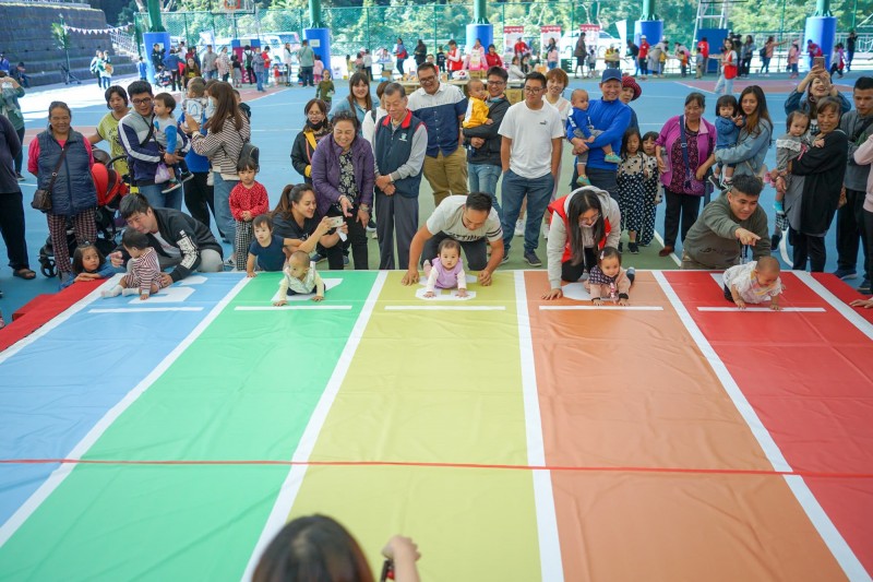 「Wah hmzyapas la, laqi ! 」(泰雅族語:孩子,來玩吧!)「原鄉親子遊戲童樂會」今早尖石鄉綜合運動登場,來自尖石鄉前、後山家庭攜家帶眷出動,約有500人同歡,現場共有15個遊戲攤位,有0-2歲寶寶進行爬行、搬尿布比賽,2-8歲學齡前孩子則開心地套圈圈、滾鐵圈、打大彈弓、丟九宮格等,闖關集點還可換玩具。