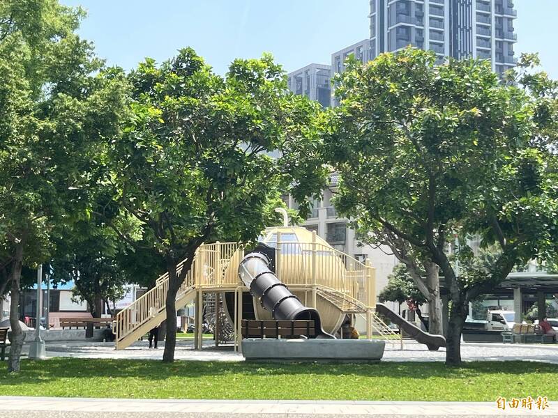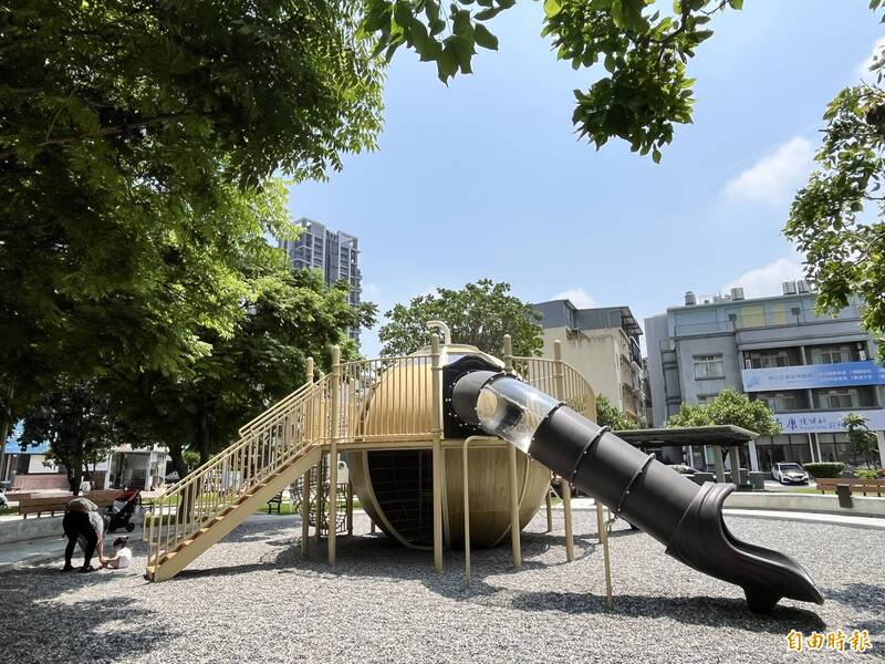新竹縣竹北市莊敬六街、鄰近遠百商圈的蔬果公園內,以「土航環線」為主題打造的特色共融遊戲場啟用。(記者廖雪茹攝)