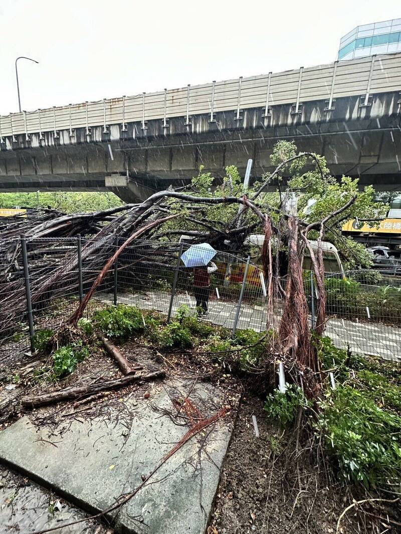 公管中心表示,今天(20日)下午因颱風外圍環流帶來強陣風及持續降雨,導致新竹市東門國小校園旁(東大路路段)一棵大型路樹倒塌,樹木壓及人行道圍籬並影響車道通行。公管中心下午4點半到現場,先行進行排除主要阻礙並開闢可供車輛通行的臨時通道,同時請警方到場進行交通管制,以確保民眾安全。