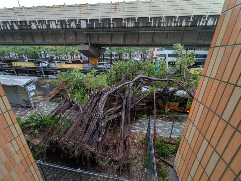 新竹市東門國小旁有大型行道樹倒塌橫躺在東大路上,造成現場交通一團亂。(照片取自東門國小臉書粉專)
