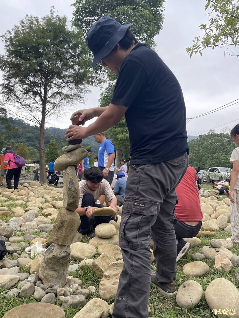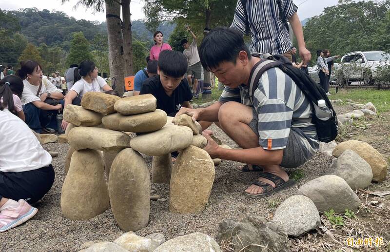 「鹿江立石大賽」參加隊伍不斷嘗試,將大小形狀各異的石頭立起來,或是參加趣味闖關遊戲。(記者廖雪茹攝)