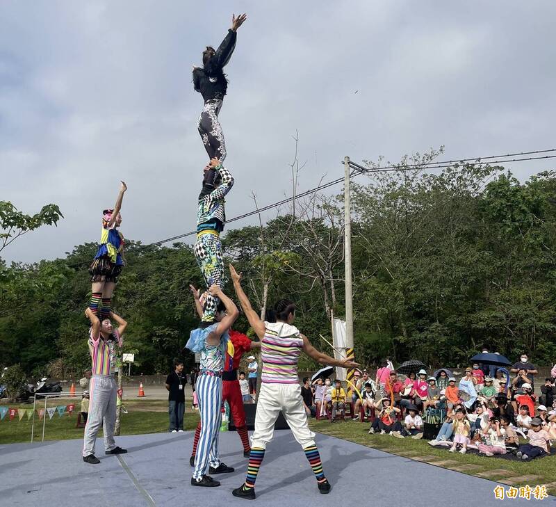 第10屆「鹿江立石大賽」今天上午在新竹縣橫山鄉桐花之丘公園登場,民眾觀賞福爾摩沙現代馬戲團表演,驚喜尖叫聲此起彼落。(記者廖雪茹攝)
